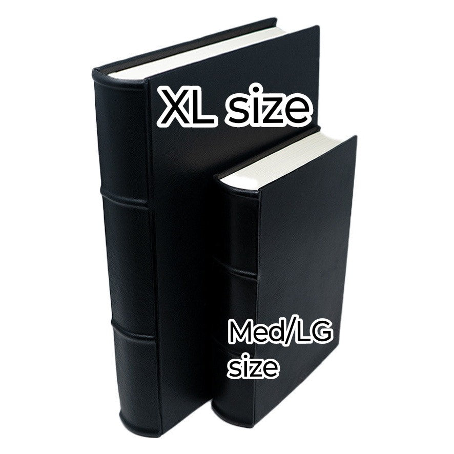 XL (25x35cm) = approx 10 x 14 inches x 2-inches thick, literally TWICE the size of the Med/Lg with 300 leaves = 600 writing pages.