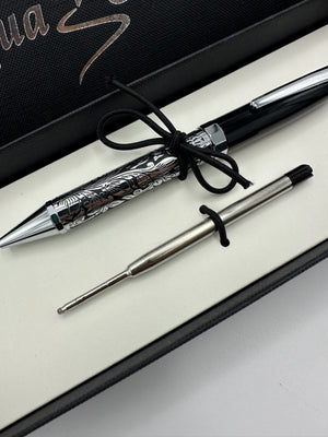 Lovely floral design on the resin barrel evokes memories of Florence. Made to last, its design and style are the perfect accompaniment to one of our elegant journals. 1 extra black ink ballpoint cartridge and the gift box are included.