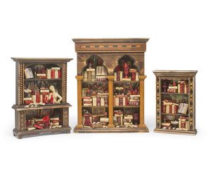 Our artisans in Florence begin with a miniature wood bookcase and, using their own creativity, add to each shelf delicately detailed books, manuscripts, scrolls, bottles, candy jars, candles, and all manner of other olde worlde household items, one at a time.