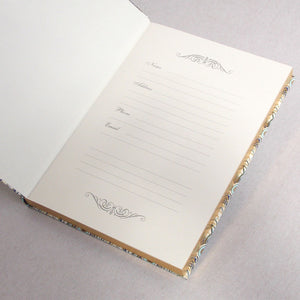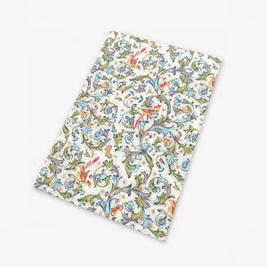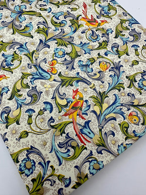 Traditional Florentine Bird pattern notebook featuring unlined, gilded pages. Pretty blue & green flowers punctuated by red-gold birds & butterflies.