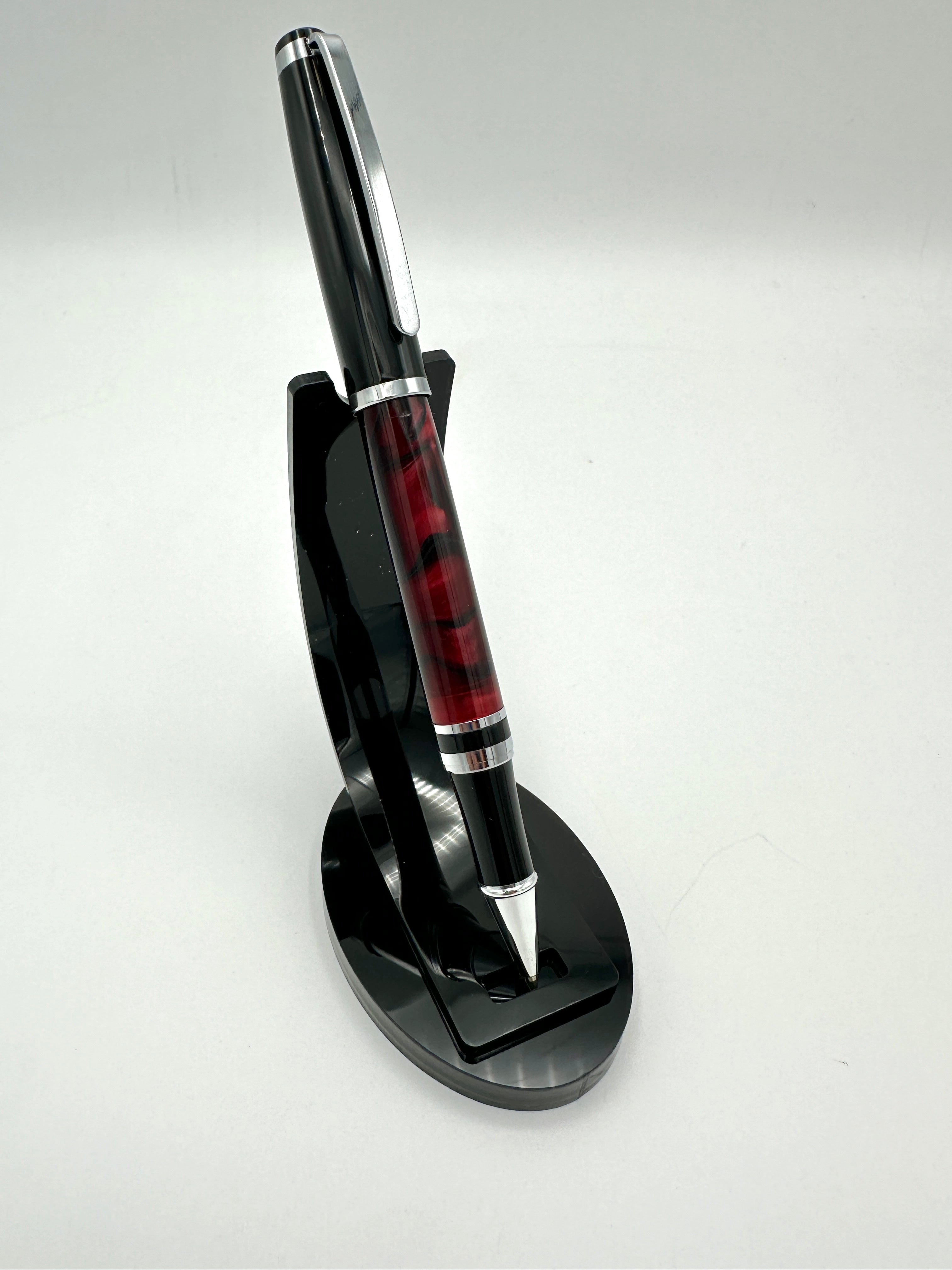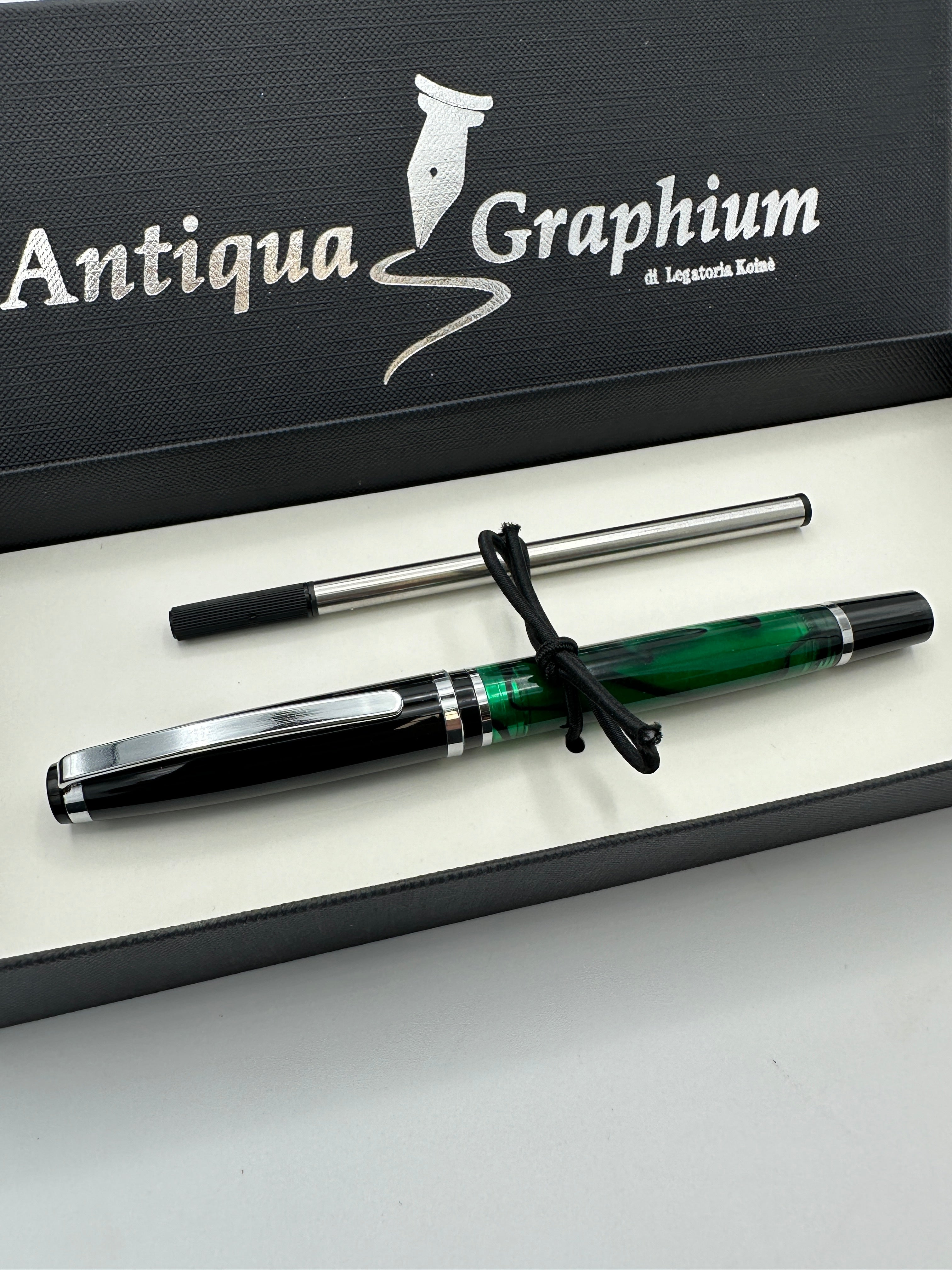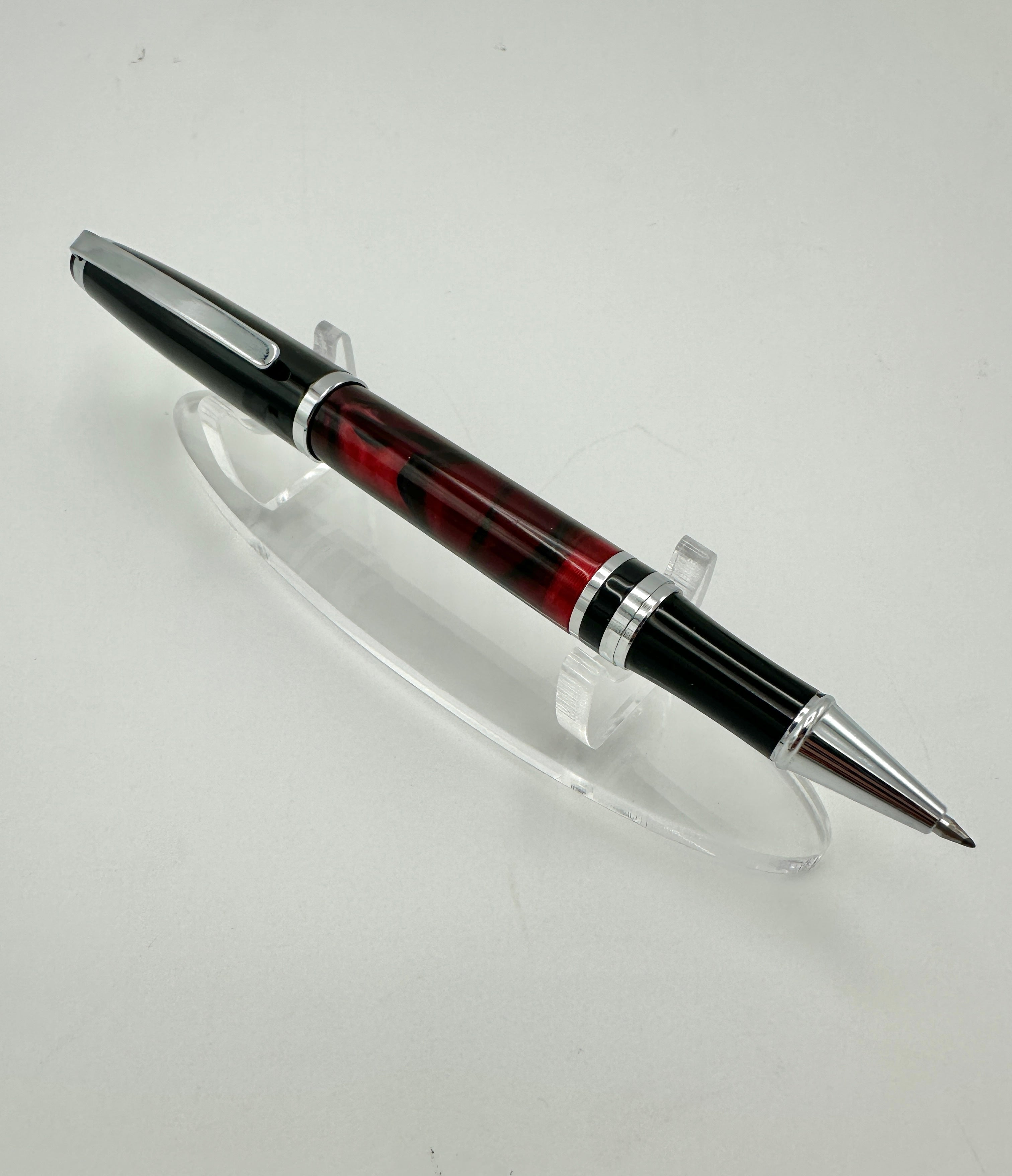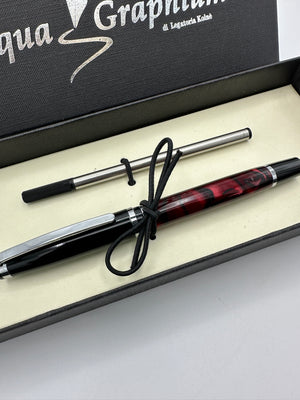 Rollerball pen with resin barrel available in 4 colors. Removable cap. 1 extra black ink roller cartridge and the gift box are included.