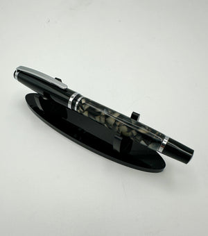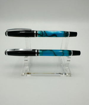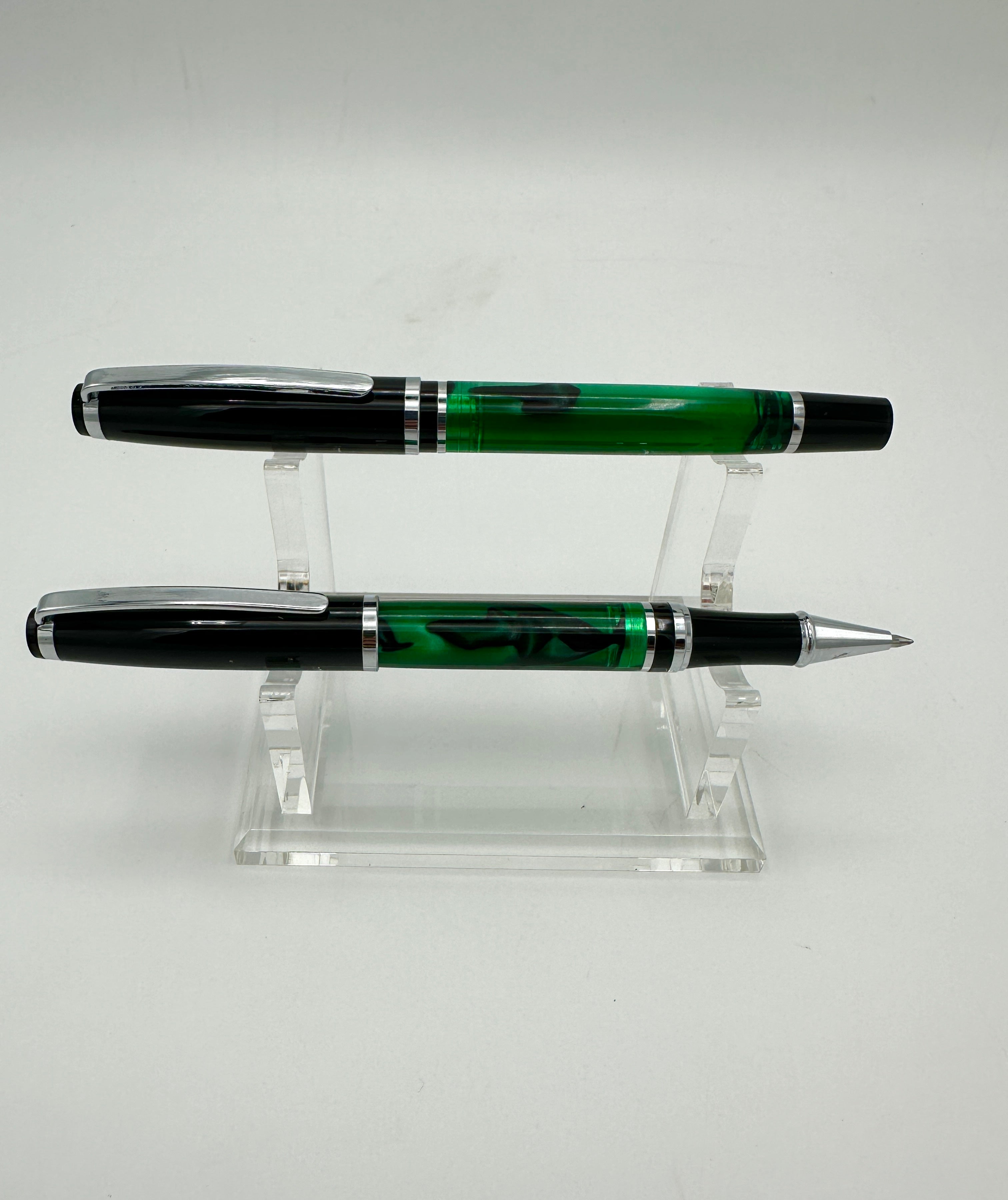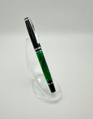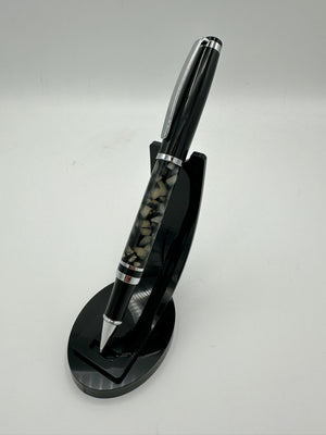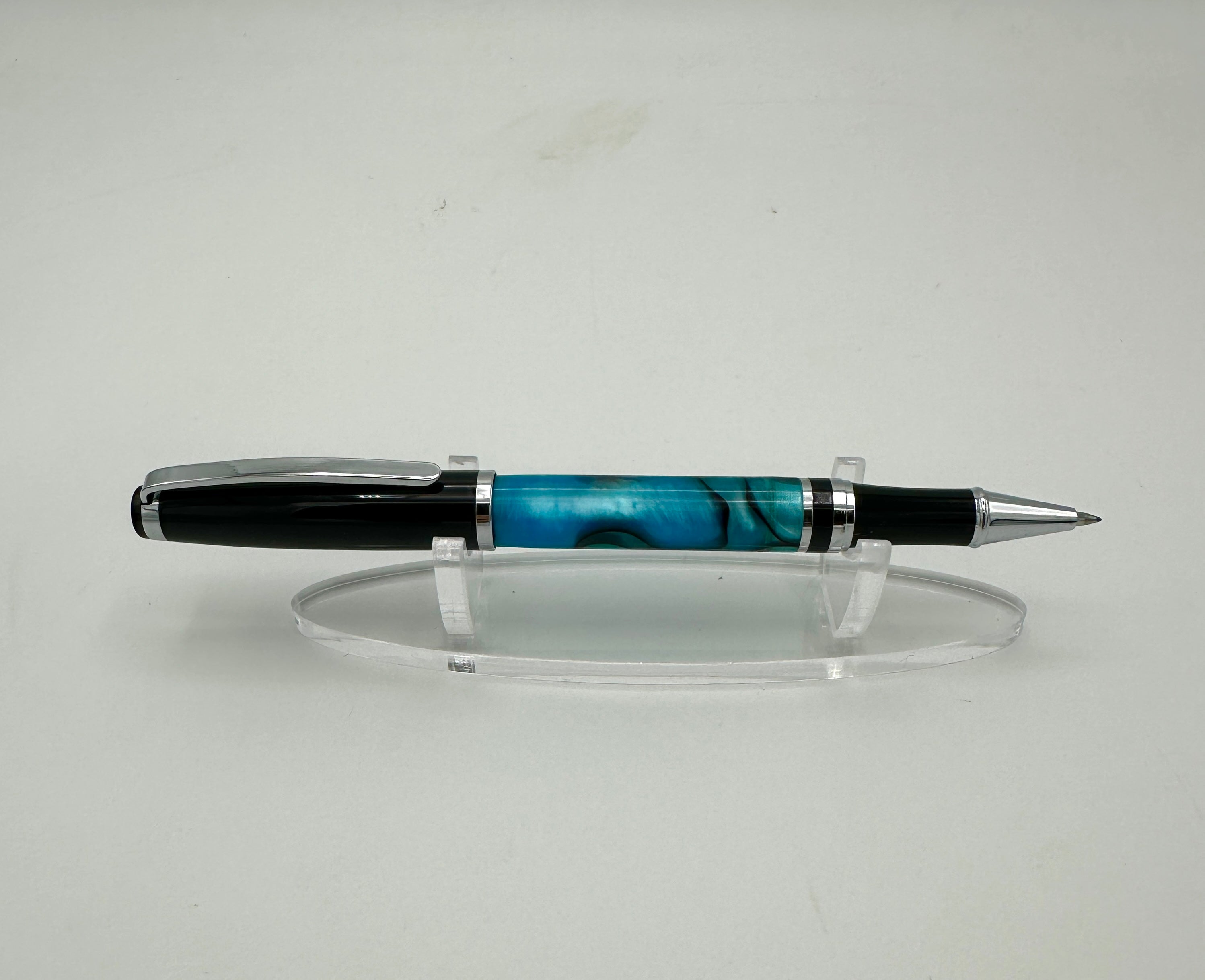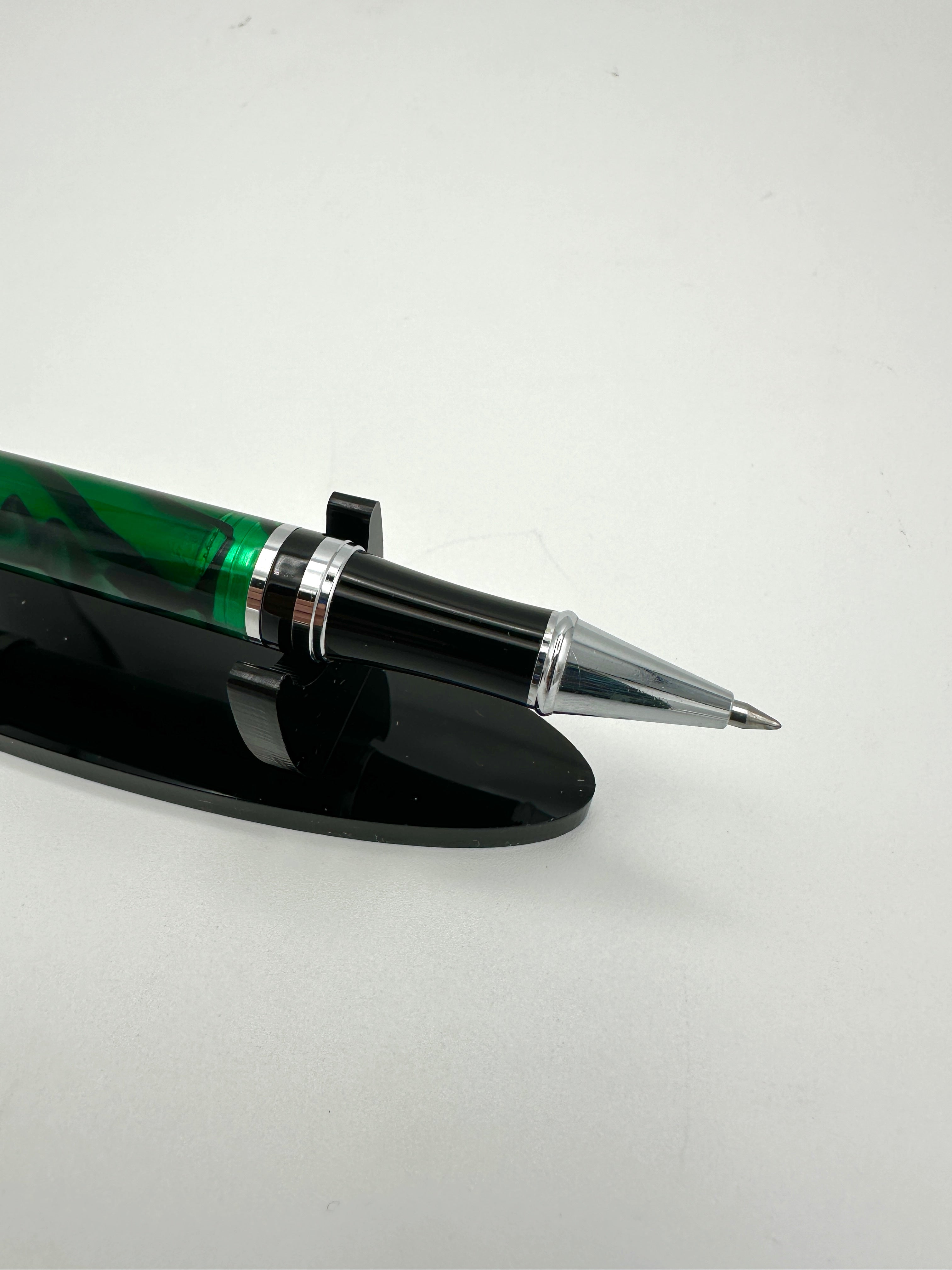 Rollerball pen with resin barrel available in 4 colors. Removable cap. 1 extra black ink roller cartridge and the gift box are included.